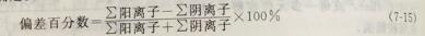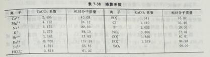 二、电中性 设计前,水分析必须用电中性法校核—即以CaCOs表示的阳离子必须等于阴离子精确平衡偏差由下式确定。 若偏差大于士10%,则在水分析中有严重错误或遗漏。为更准确地设计,应获得更完全的水分析。 如果偏差小于士10%,则若阳离子低增加Na*,阴离子低增加SO来早衡。表7-38 给出了水分析中的各种离子由 mg/儿离子变为mg/L CaCO。的换算系数, 由mg/L离子变为mg/L CaCO需乘以系数,由 mg/LCaCO变为mg/L离子需除以系数。